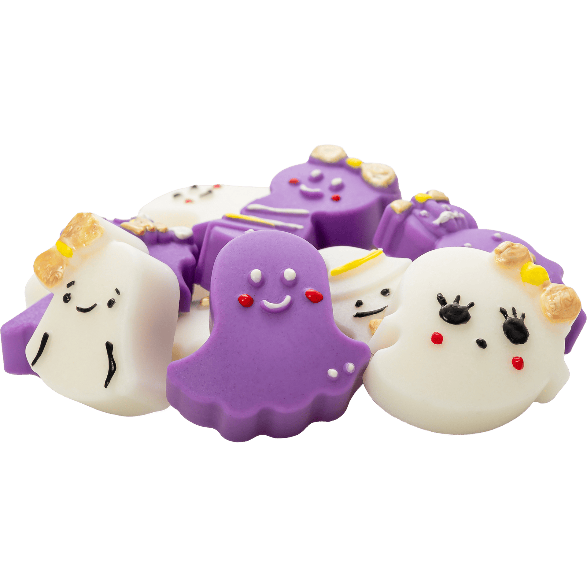 Nuestros Wax Melts de Calabaza Especiada tienen un diseño único y encantador: pequeñas figuras de fantasmas en blanco y morado, cada una con detalles pintados a mano.