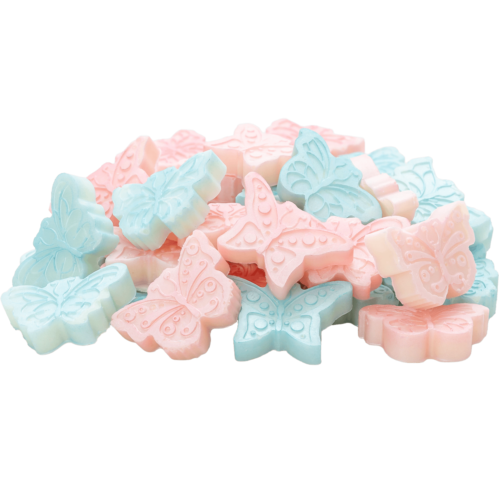 Nuestros Wax Melts de Flor de Loto destacan por un diseño inspirado en la naturaleza, con formas de delicadas mariposas que combinan suaves tonos azul celeste y rosa claro.